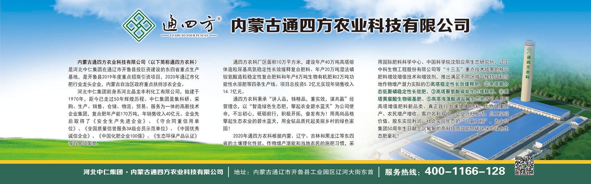 內(nèi)蒙古通四方農(nóng)業(yè)科技有限公司(以下簡(jiǎn)稱(chēng)通四方農(nóng)科)是河北中仁集團(tuán)在通遼市開(kāi)魯縣投巨資建設(shè)的東四省重點(diǎn)生產(chǎn)基地,是開(kāi)魯縣2019年度重點(diǎn)招商引資項(xiàng)目,2020年通遼市化肥行業(yè)龍頭企業(yè),內(nèi)蒙古自治區(qū)政府重點(diǎn)扶持涉農(nóng)企業(yè)...